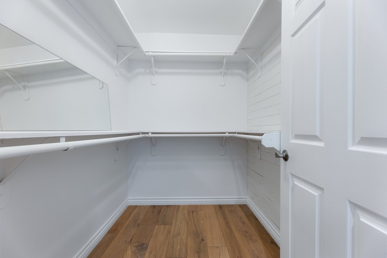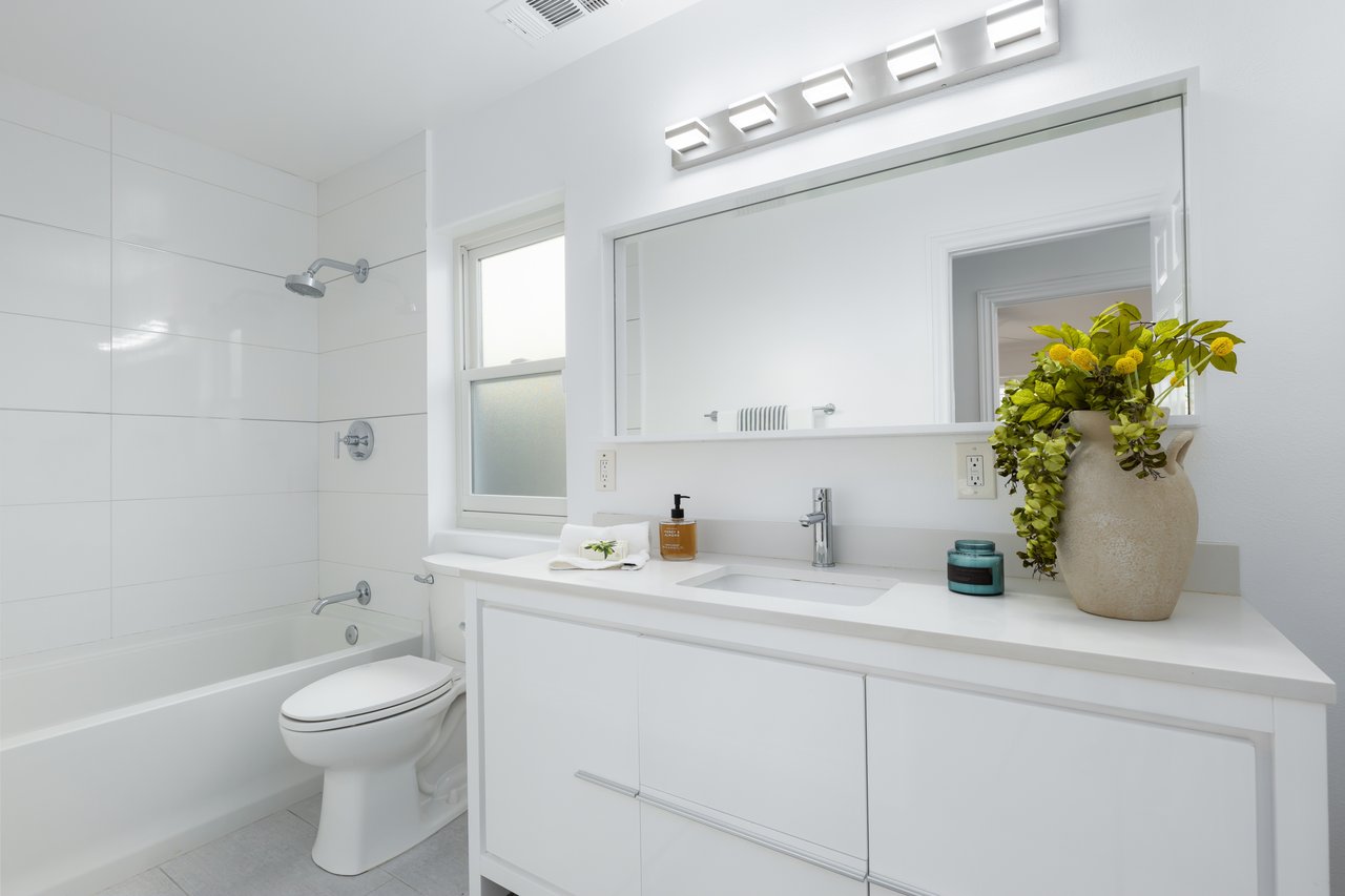 Each end of the main floor features private living space: on one side is the primary suite, which serves as a true retreat, featuring vaulted ceilings and direct access to the large, private terrace. The ensuite bathroom is thoughtfully designed with a dual vanity, freestanding soaking tub, large glass shower, private toilet room, and a spacious walk-in closet. On the opposite side of the main floor, an additional front bedroom features a private terrace with view of the tree-lined street, and a powder room for guests.