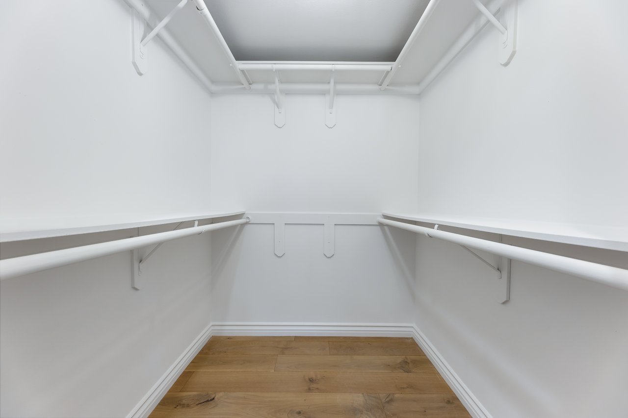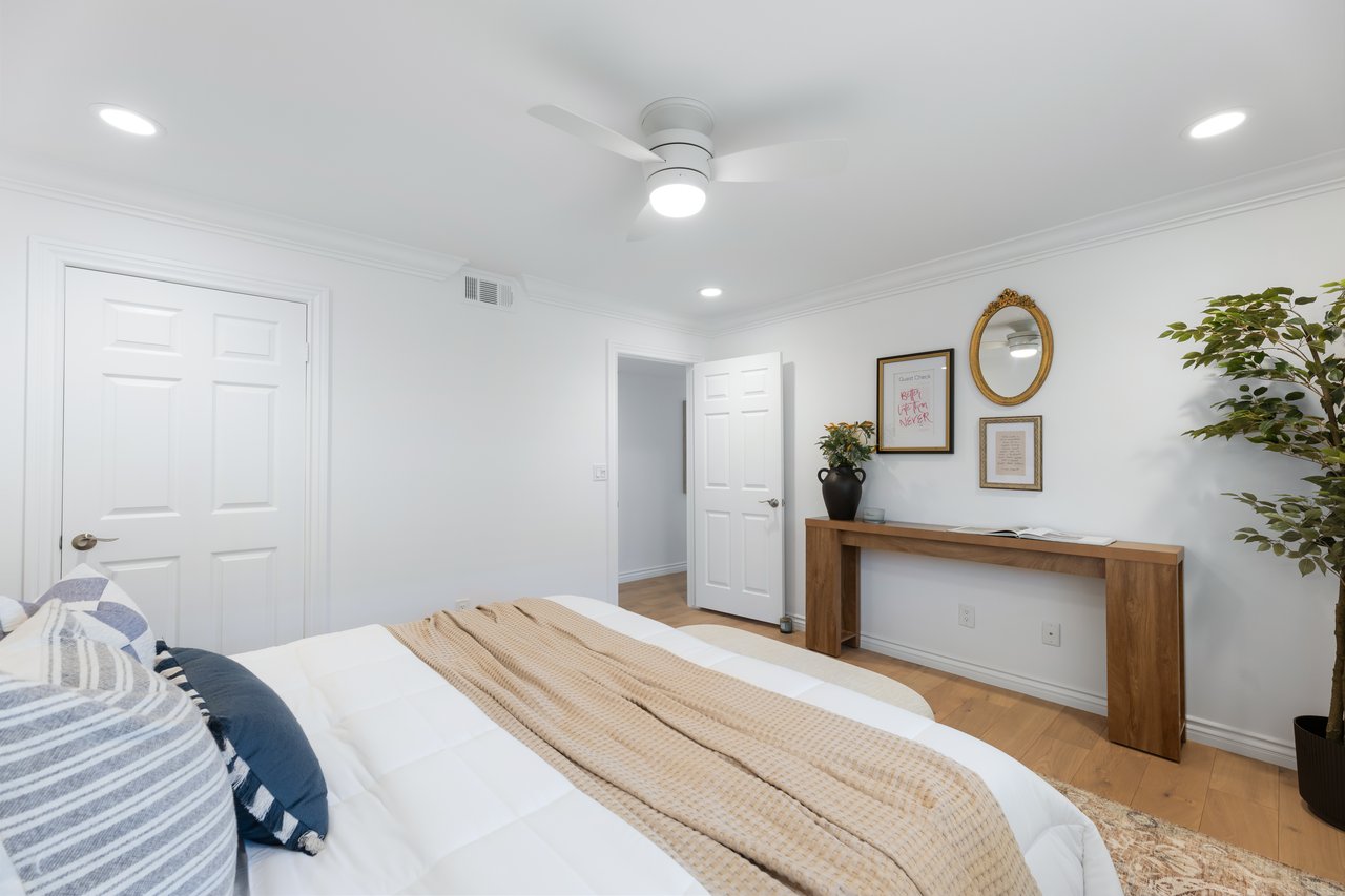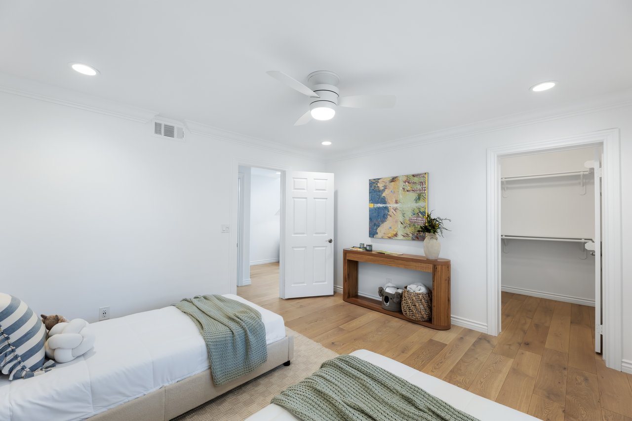 On the lower floor, there's additional flex space beneath double-height ceilings that opens to the front patio through sliding glass doors, ideal as a home gym, sitting area, or secondary office. Down the hall there are two bedrooms with large walk-in closets and abundant natural light, complemented by a full bathroom.