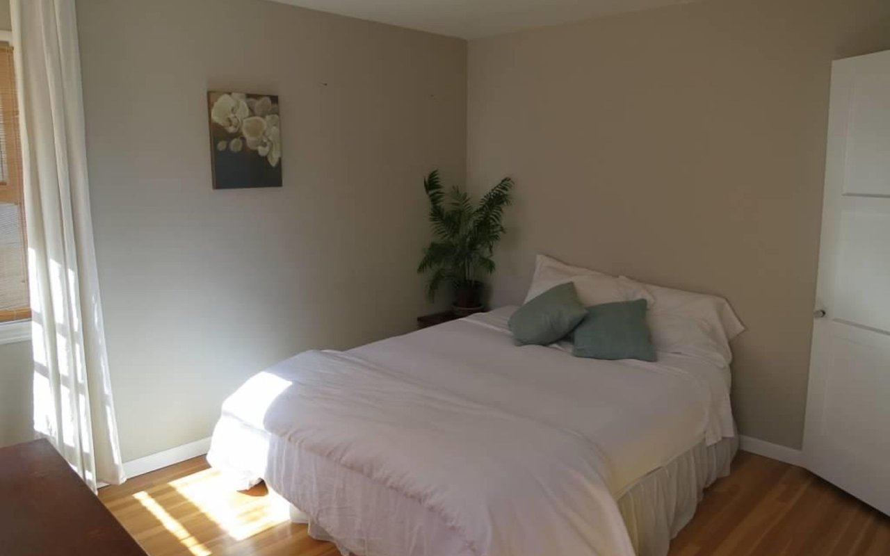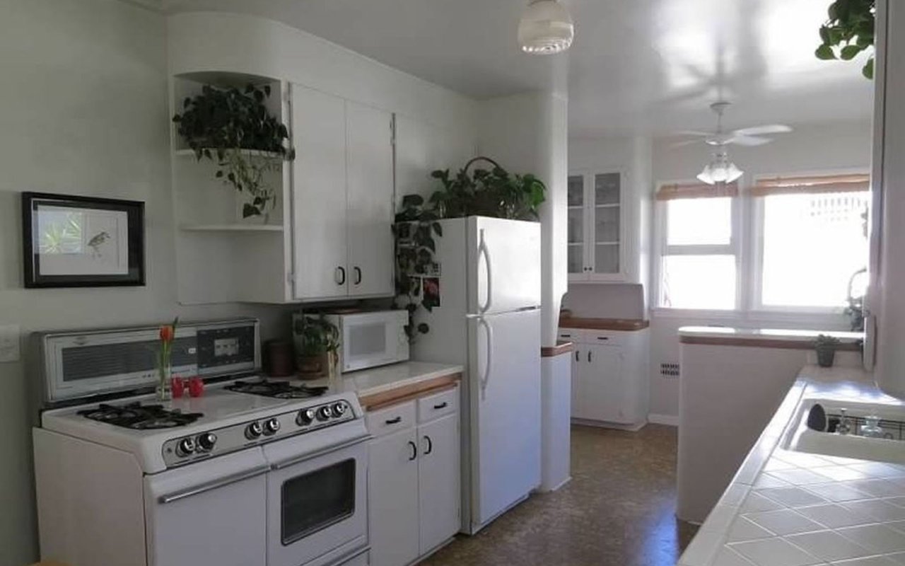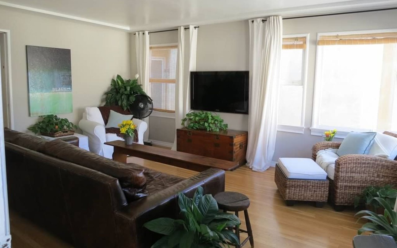 Represented seller. Beautiful cottage-style home located steps from the sand. Nothing else like it on the market! Just West of Highland Avenue, this home features a corner view down to the ocean from large living room windows. Original oak wood floors add charm throughout the house. Upstairs there are two bedrooms finished with large windows, including floor to ceiling drapery. The upstairs shared bathroom has been beautifully renovated with tub and shower combo, custom tile, new fixtures, and a large wall mirror. The bright and open kitchen includes a cozy dine-in area, white cabinetry, glass door detailing, tile countertops, cork floors, plus a classic O'Keefe and Merritt 4-burner range, and a refrigerator. A short flight of steps adjacent to the kitchen leads downstairs to the third bedroom, which can be a Master or Guest Suite. This space features its own separate entrance, a ceiling fan, a deep raised closet, and an updated en-suite bathroom with shower. Separate from this space, there is a laundry nook with a newer stacked washer or dryer. Outside the house, the bonuses continue: located behind the house is a shared back patio area that is perfect for barbecue and seating area. The one-car garage features two storage areas: a large storage room through a door inside the garage, and a smaller storage room accessible from outside the garage, which is perfect for bikes and surfboards. The garage door is manually operated. The house is wired for cable and satellite. There is central heat; no air conditioner. Tenants pay all utilities. Pet okay with deposit and references. Additional parking available within walking distance, permit paid by owner.