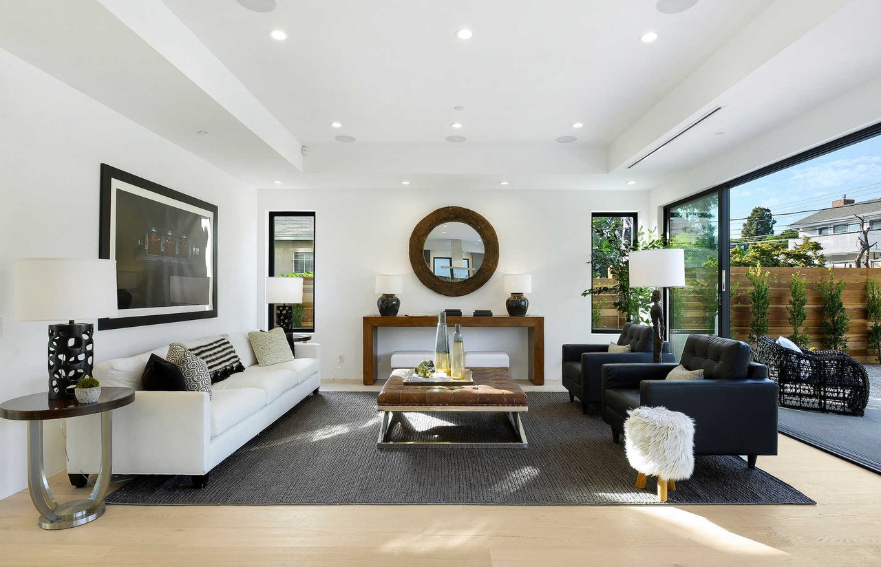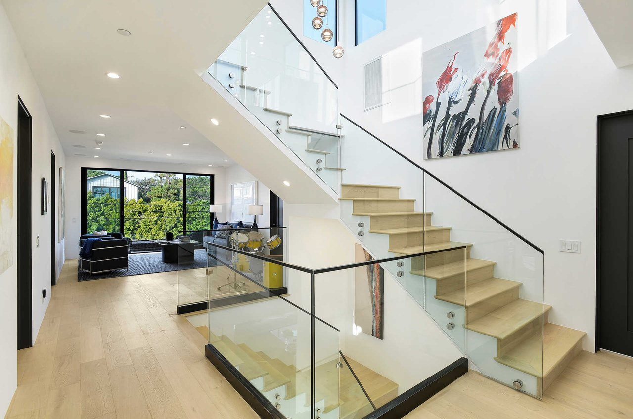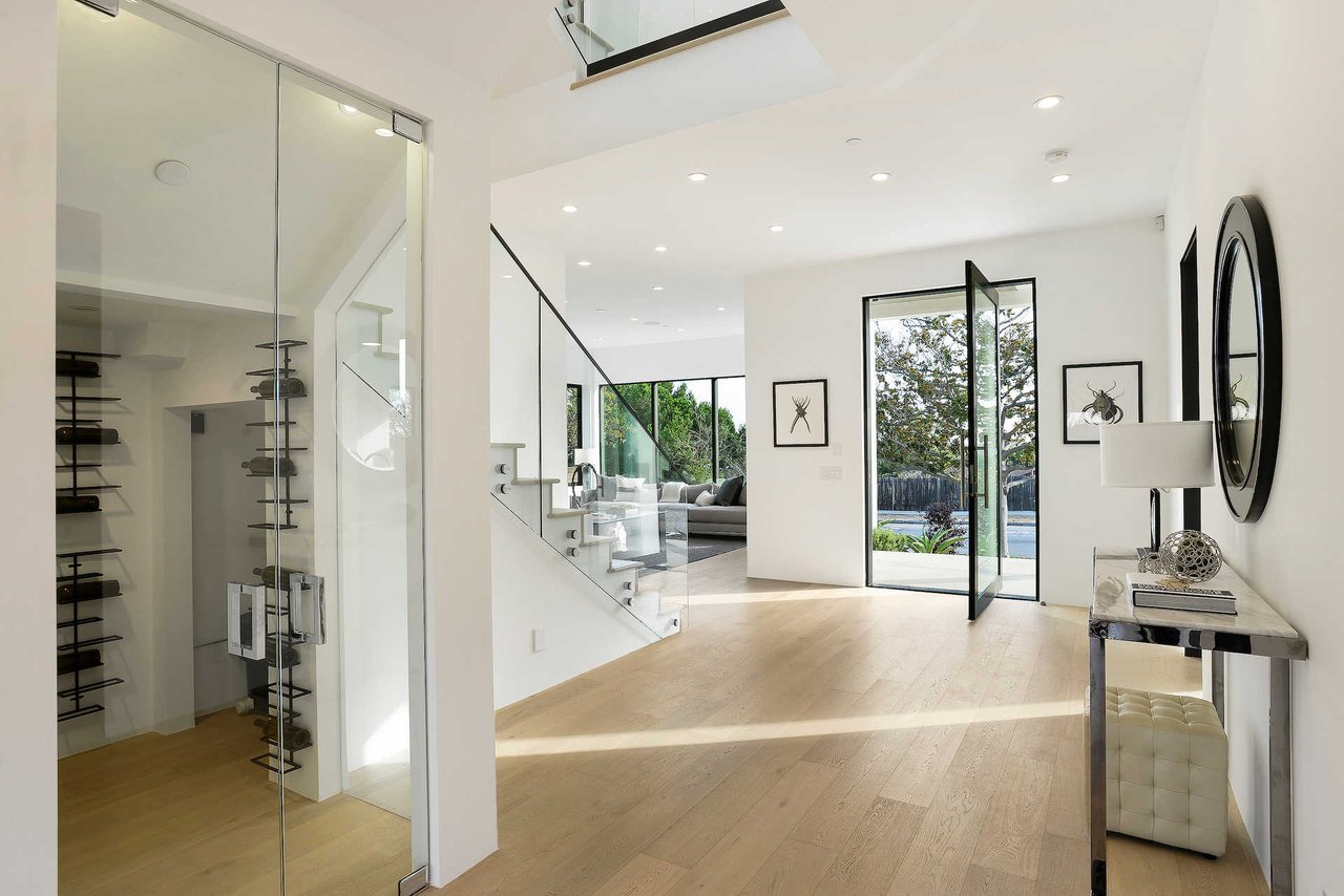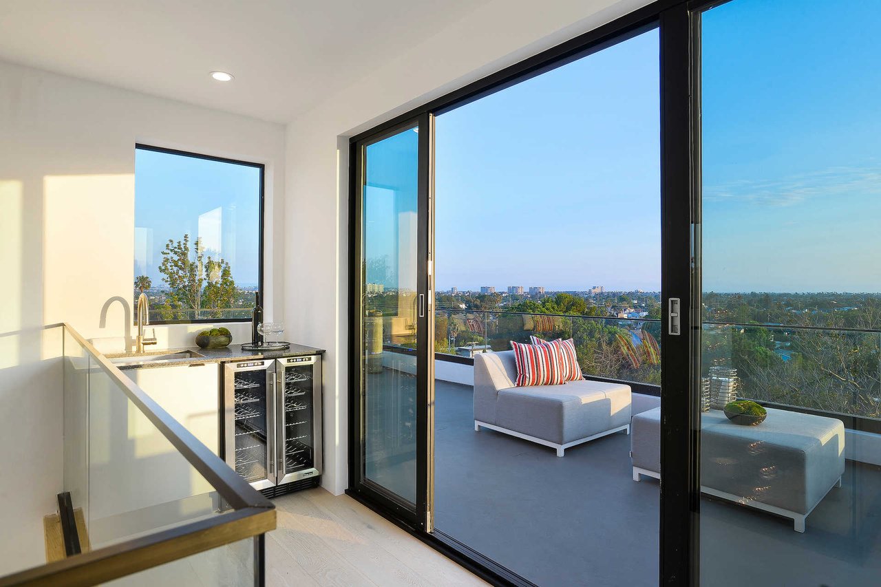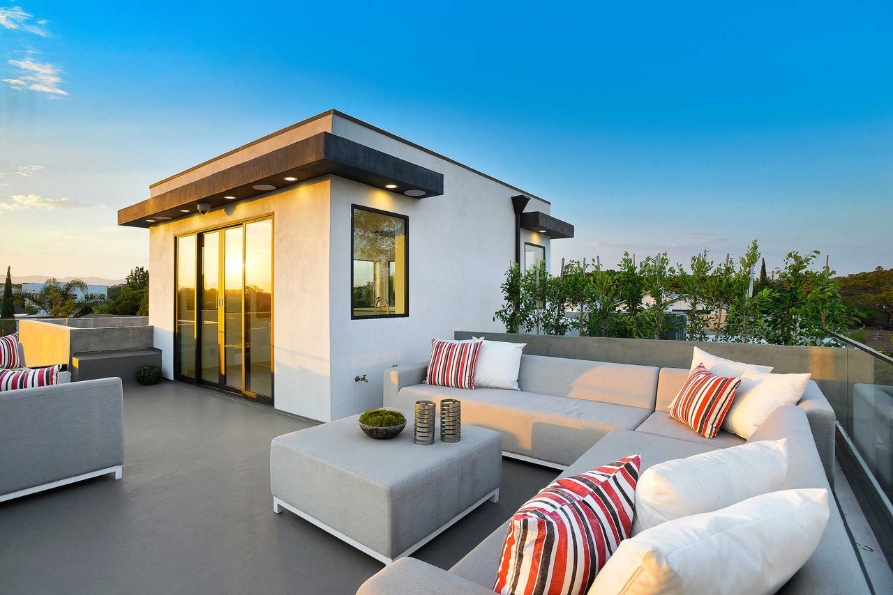 This newly constructed luxury "smart home, " conceived by designer Saman Takaloo, offers an oversized pivot door that steps into an airy, spacious room with oak flooring, countless custom features, and a wine cellar under the stairs. Living room exudes views of the homes below and marina. Pass through the dining room and head to the sleek, modern kitchen which seamlessly flows into the family room and backyard via vanishing sliding glass doors that practically open up the entire wall to the grass area, fire pit and garage beyond. The first-floor bedroom has an accompanying bathroom and doubles as a great office space. All four upstairs bedrooms are precisely placed in separate corners of the house. Step out of any bedroom and enjoy the large living area with attached balcony overlooking the backyard. Each bedroom has its own private bathroom, and the master suite balcony presents 180 degree views from the marina to the mountains. Rooftop patio above includes indoor wet bar.