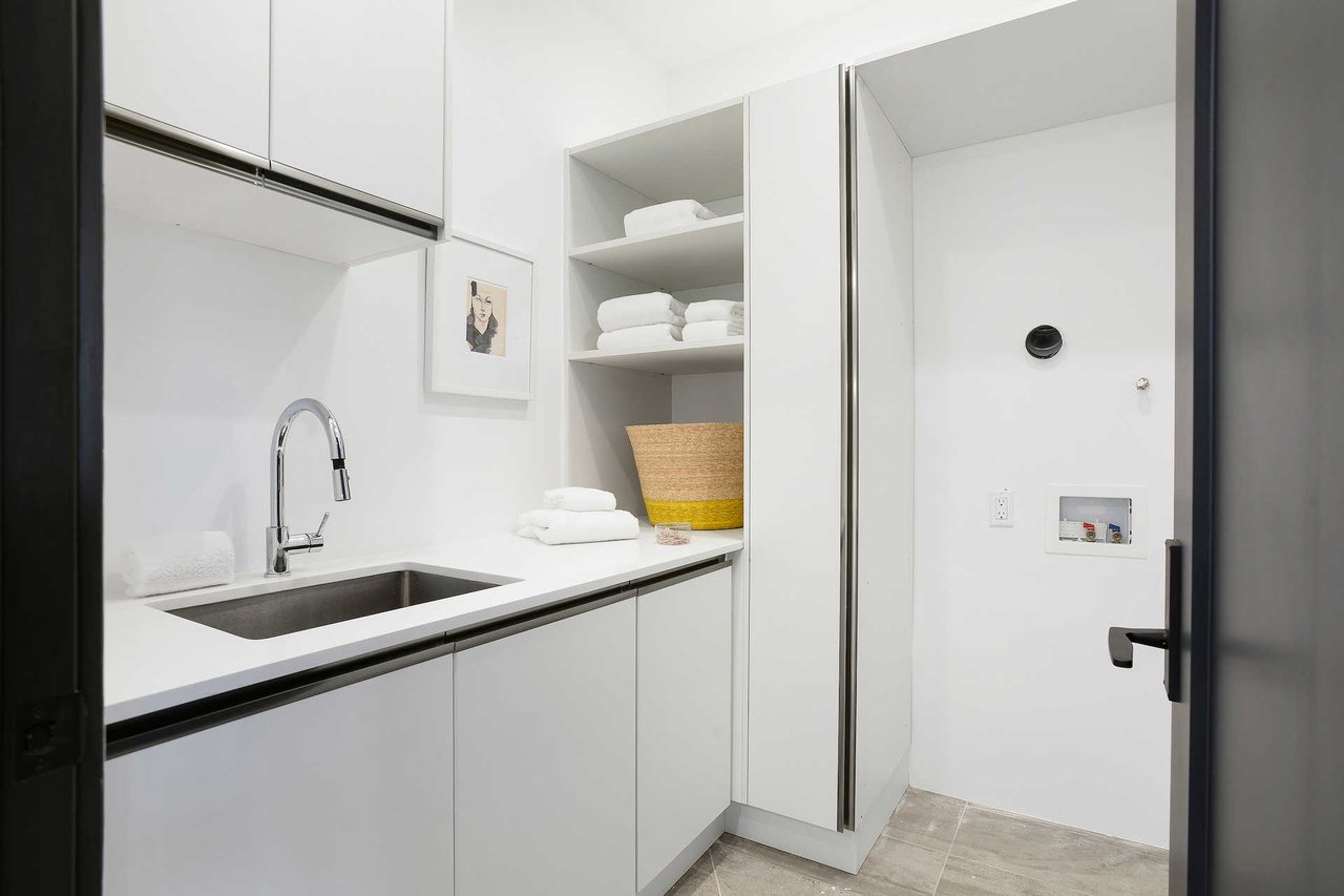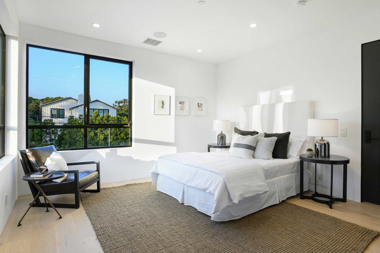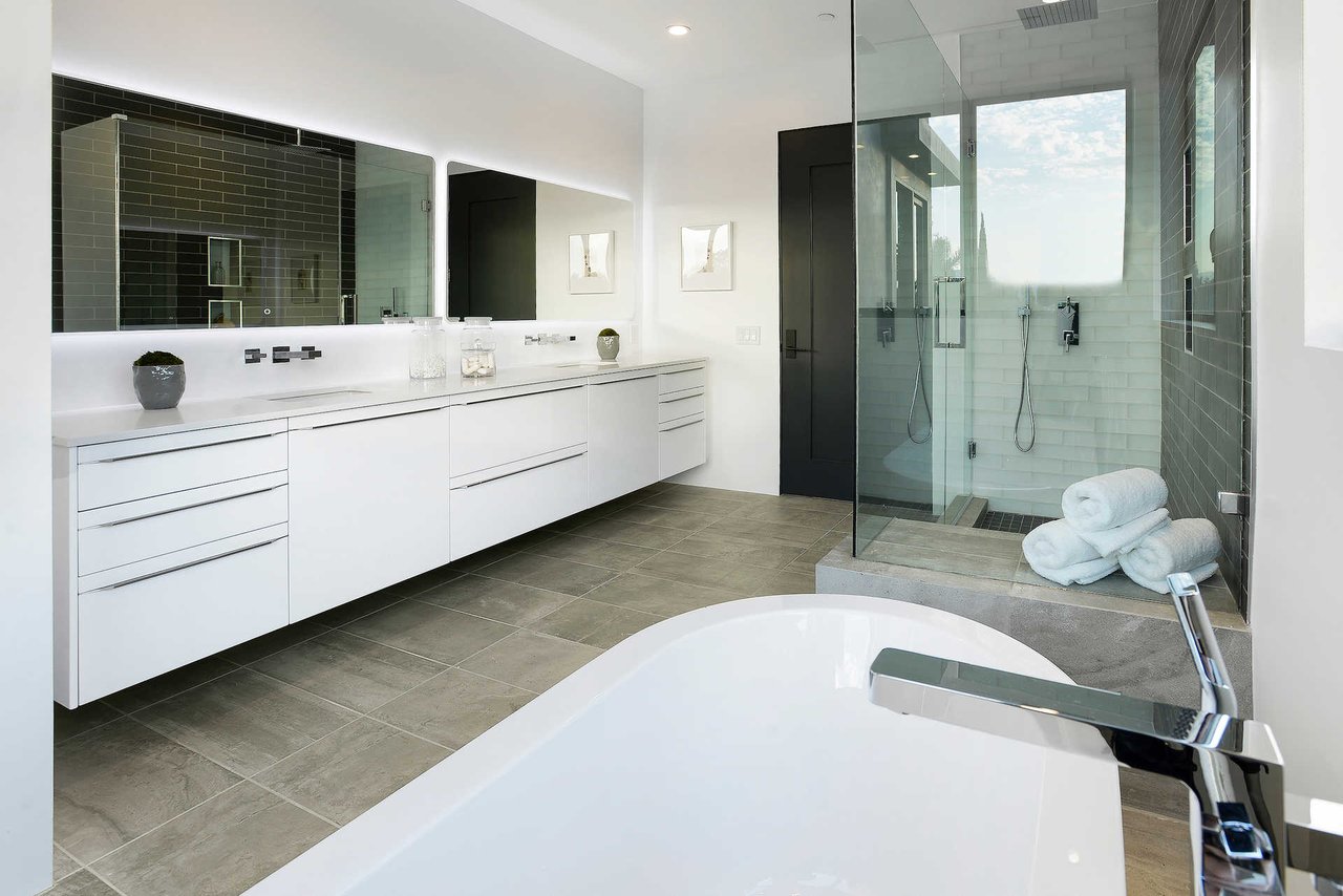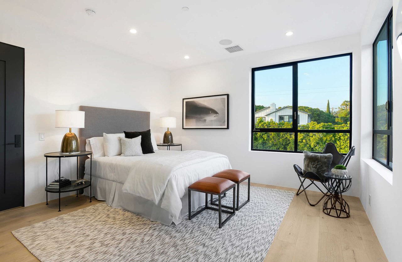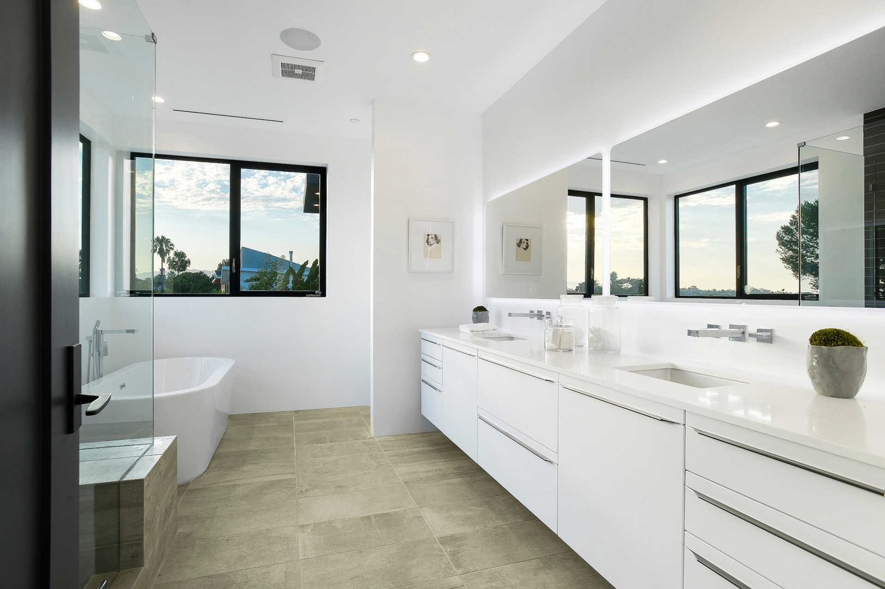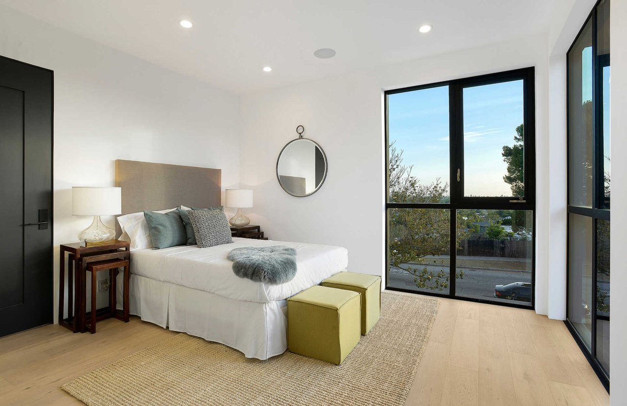 This newly constructed luxury "smart home, " conceived by designer Saman Takaloo, offers an oversized pivot door that steps into an airy, spacious room with oak flooring, countless custom features, and a wine cellar under the stairs. Living room exudes views of the homes below and marina. Pass through the dining room and head to the sleek, modern kitchen which seamlessly flows into the family room and backyard via vanishing sliding glass doors that practically open up the entire wall to the grass area, fire pit and garage beyond. The first-floor bedroom has an accompanying bathroom and doubles as a great office space. All four upstairs bedrooms are precisely placed in separate corners of the house. Step out of any bedroom and enjoy the large living area with attached balcony overlooking the backyard. Each bedroom has its own private bathroom, and the master suite balcony presents 180 degree views from the marina to the mountains. Rooftop patio above includes indoor wet bar.