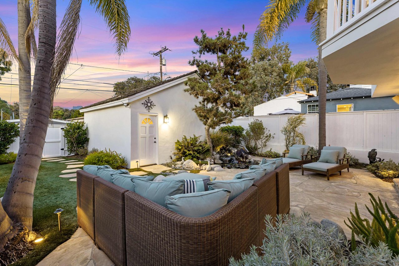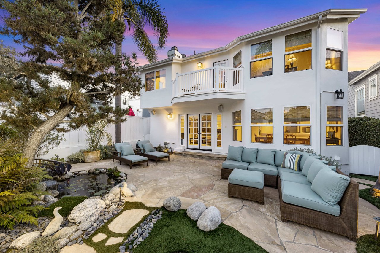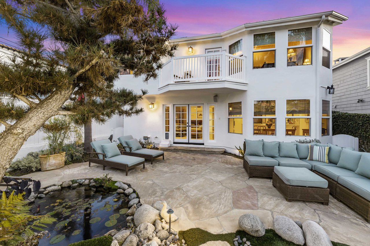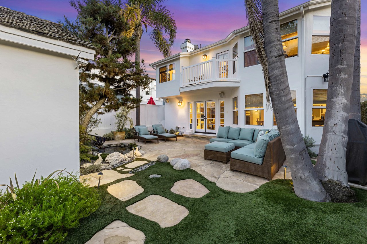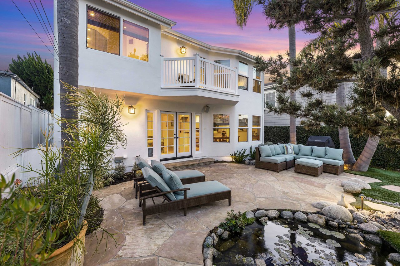 This exquisite residence situated in the desirable Tree Section of Manhattan Beach includes 3 bedrooms, 2.5 bathrooms, and a generous 2,856 square feet of living space. A white picket fence and gorgeous front lawn greet you upon entry. Once inside, you'll be instantly struck by the warm and inviting traditional interior seamlessly blending timeless elegance with contemporary functionality. The main level reveals spacious living areas, ideal for entertaining and creating lasting memories. Each room is thoughtfully separated, providing both privacy and individuality. The living room features a vaulted A-frame ceiling and a wood burning fireplace, creating an inviting atmosphere. The formal dining room is intimate, perfect for hosting memorable dinners. The kitchen is equipped with high end stainless steel gourmet appliances, including Sub Zero refrigerator, Viking cooktop, KitchenAid double oven with convection, and Miele dishwasher, making cooking a true pleasure. The large eat-in nook on the other side of the kitchen is bathed in natural light and looks out to the backyard complete with slate patio, mature landscaping, turf lawn and koi pond. The adjacent family room has a beautiful cast stone fireplace, built in bar, and opens up to the backyard through French doors. All of the bedrooms are generous in size and upstairs where the laundry is conveniently located. The primary suite is oversized with vaulted beamed ceilings, two large closets and a patio overlooking the yard. The bath has a soaking tub, separate shower with steam and enclosed toilet. Additional amenities include AC, two car garage with built in storage, additional two car parking in alley and Tesla charging. Nestled in the highly sought-after Tree Section of Manhattan Beach it offers an ideal location with easy access to a wide array of amenities. Discover parks or the nearby local beach, or explore the vibrant dining and shopping scene. Property is currently fully furnished and can remain furnished.