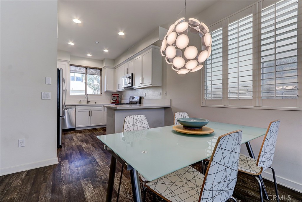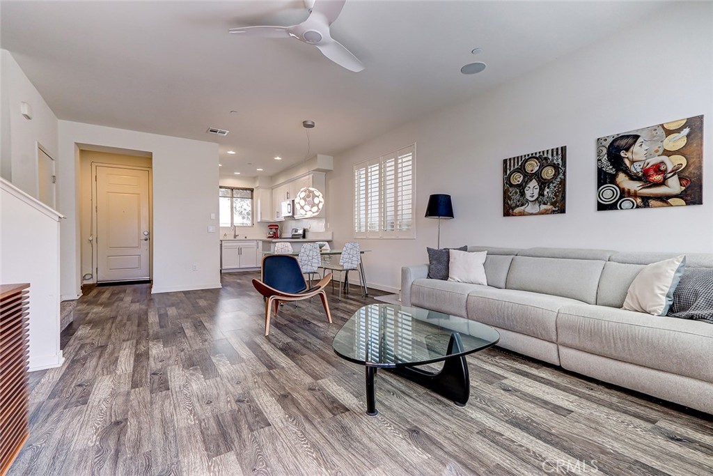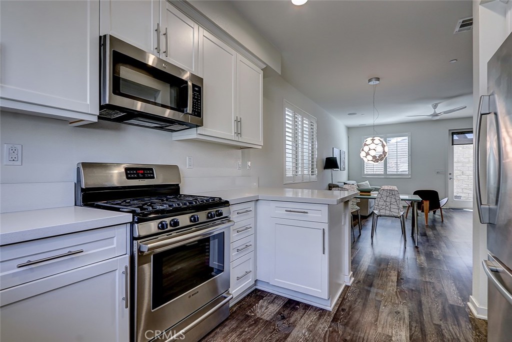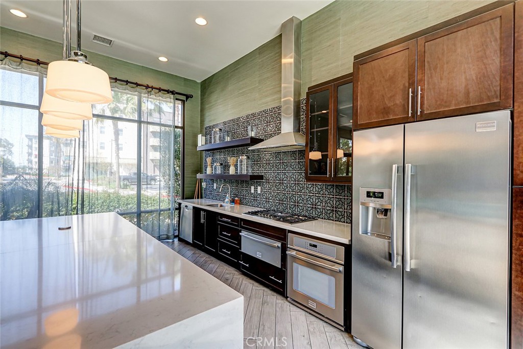 Step inside to a bright and airy interior featuring tasteful laminate flooring. The open-concept kitchen is a chef's delight, equipped with stainless steel appliances including a gas oven and stove, refrigerator, freezer, and dishwasher. Recessed lighting adds a modern touch.